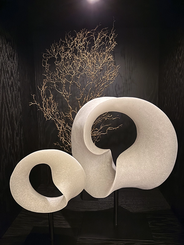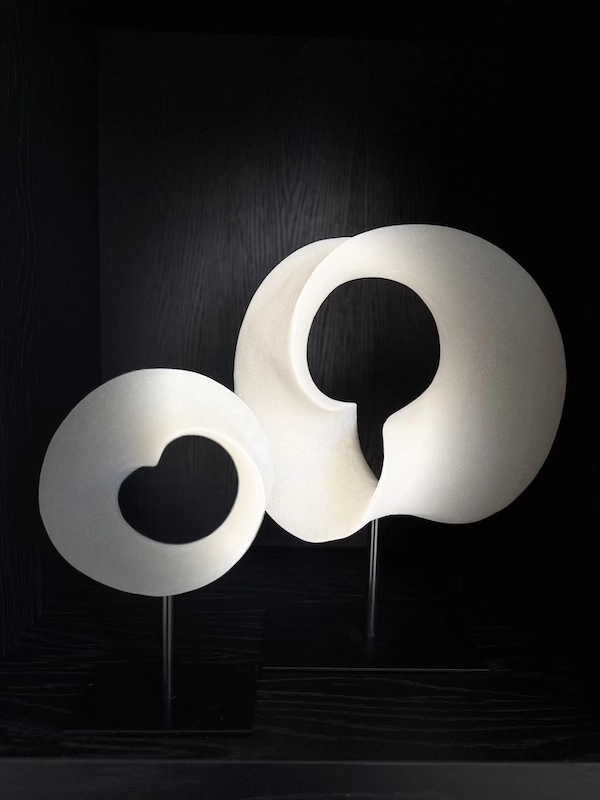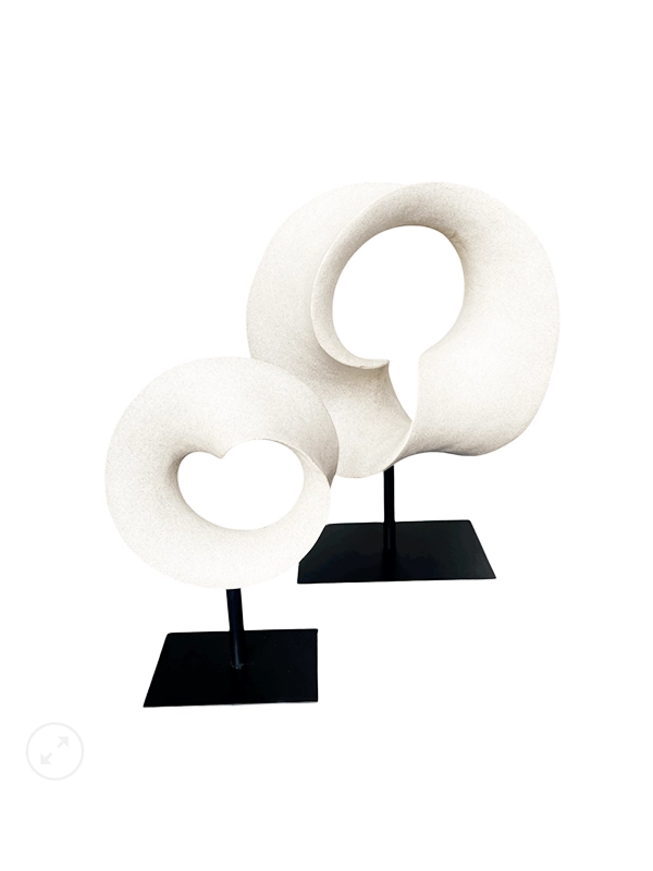 Ontdek de betoverende schoonheid van deze witte ornamenten. Abstracte vormen, geïnspireerd op organische beweging en kosmische harmonie. Gemaakt van kwartscomposiet en translucent resin in een zuiver wit dat subtiel speelt met het licht.