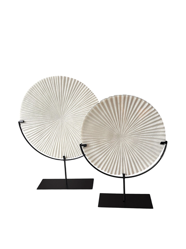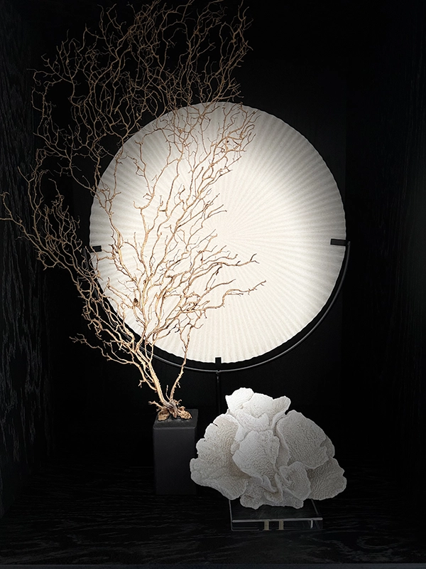 De schijf is stijlvol bevestigd aan een slanke, zwarte metalen frame dat naadloos integreert met de omringende gouden takken en sculpturen. Dit minimalistische ontwerp contrasteert perfect met donkere achtergronden, zoals zwart gelakt hout, en voegt een laag van textuur en diepte toe aan moderne, boho-chique of Japans geïnspireerde ruimtes. Of het nu in een woonkamer, slaapkamer of entreehal hangt: deze wandschijf straalt rust en verfijning uit, en is een subtiel statement van elegantie zonder overdaad.