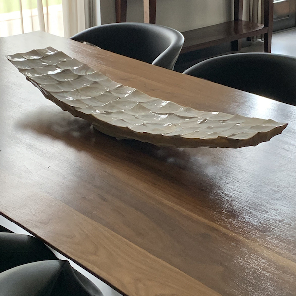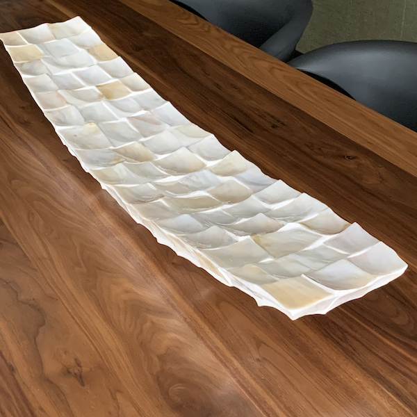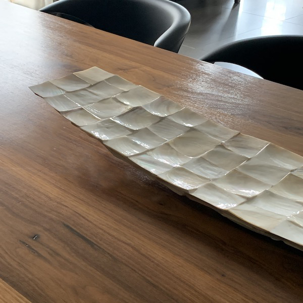 Schelpen schaal parelmoer wit. Prachtige langwerpige schaal van Mother of Pearl White schelpen. Parelmoer is de iriserende binnenvoering van schelpen. Het wordt meestal aangetroffen in drie soorten weekdieren: pareloesters, zoetwatermosselen en zeeoor. Om de binnenkant van hun schelpen te beschermen tegen parasieten bedekt het weekdier het met parelmoer – een organische stof die parelmoer zijn iriserende werking en uitgesproken schoonheid geeft. Deze veelkleurige irisatie wordt veroorzaakt door de manier waarop licht reflecteert op de lagen parelmoer op de schaal. Deze schaal is 102 cm lang en is gemaakt van vakkundig geslepen schelpen. Een waar kunstwerk om te zien!